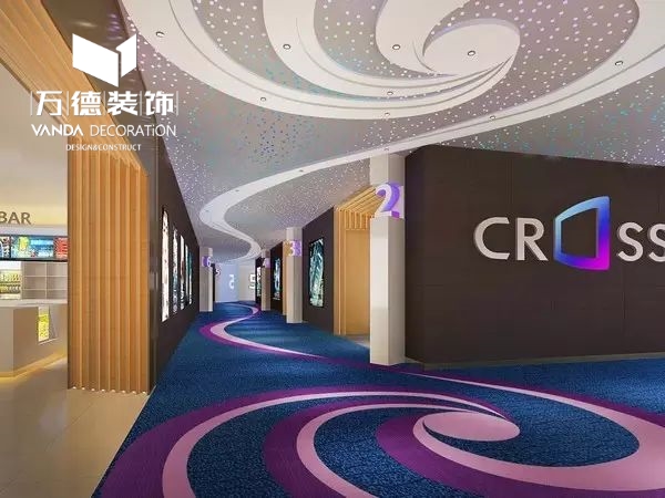 利用直线,三角,圆点的几何元素,流畅的延伸、上下的叠加、交错的贯穿,相互邂逅与碰撞,组合出打破常规的设计,擦出了空间另类的艺术花火,凸显创新的魅力。富有质感的先型现代材料给人强烈的视觉冲击力,光束的多种镭射方式使空间没有丝毫的单调。如电影走廊中天花的圆点与地面的圆点间的贯穿与联系,就像在天地之间的时空穿梭,演绎着电影般的激情与奇幻。这是为年轻人群量身打造的多功能性设计,兼顾声学设计与环境装饰于一体的电影院,如星空般的屋顶,犹如身处幻境,同样是浪漫星空的屋顶,在紫色的主色调中点缀得熠熠生辉。