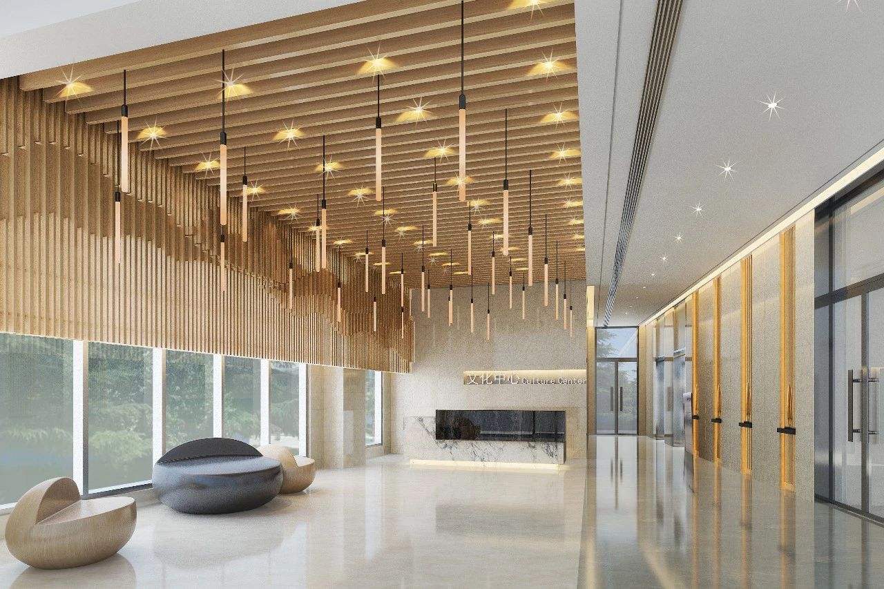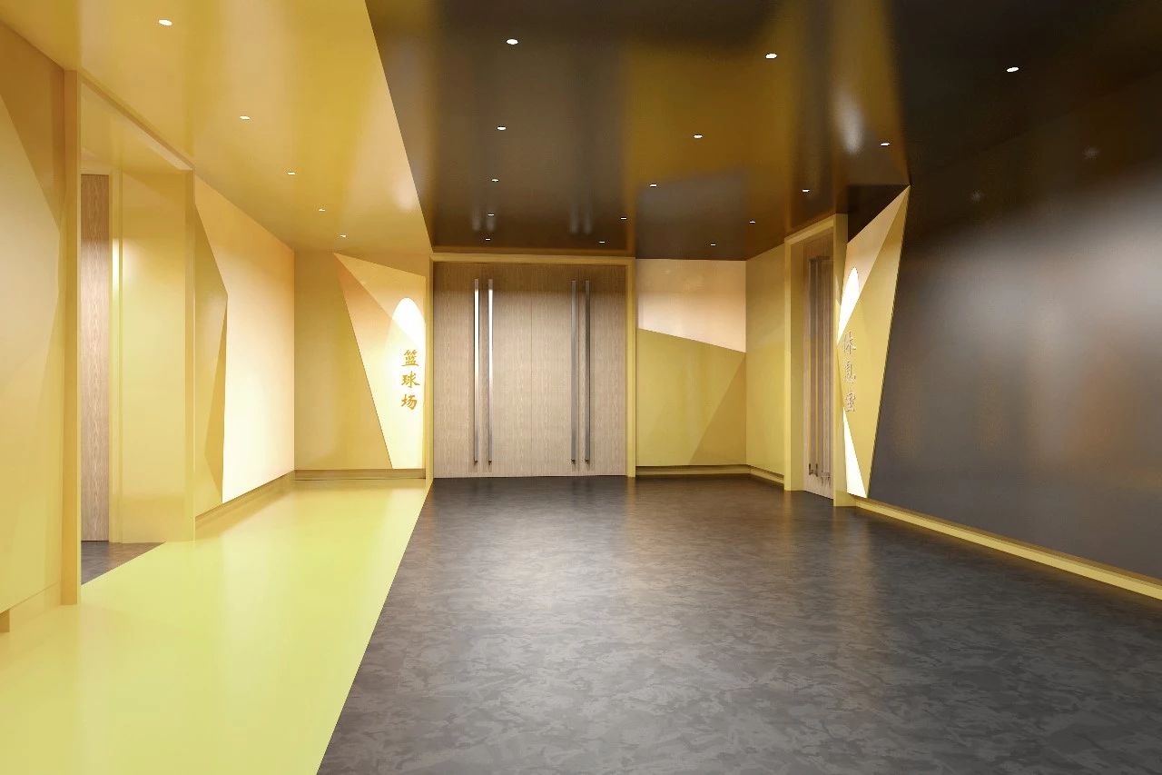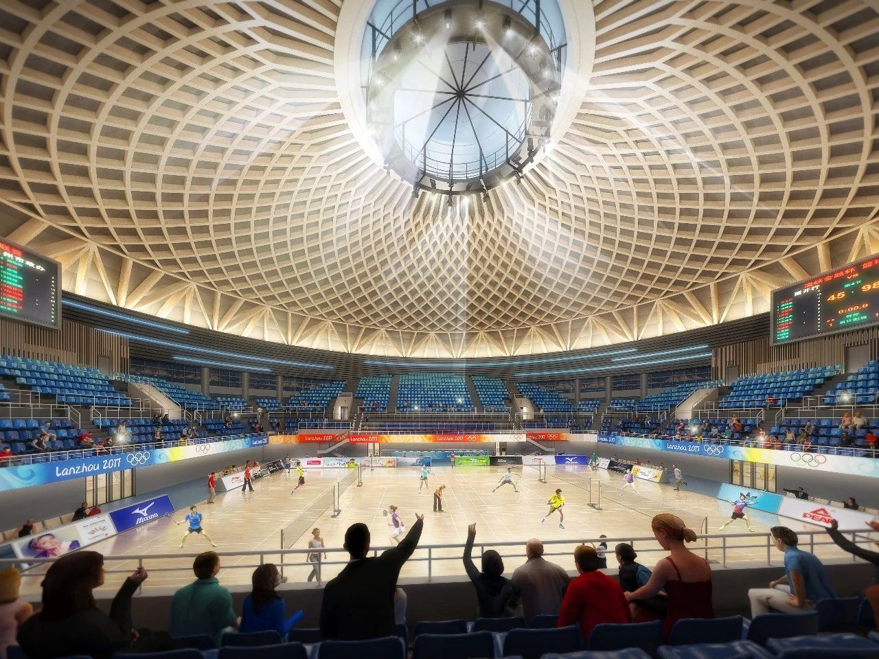 从太阳的能量辐射意象中找到与党和政府象征的贸合,在体育馆的天花设计上,采用木纹铝与穹顶结合,形成一个很有气势的感召空间。