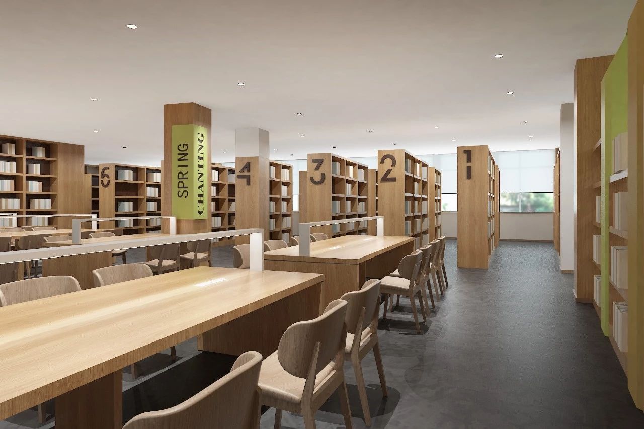 图书馆的空间布局巧妙地将藏与阅结合起来,强调人的主体地位,充分体现“一切为了读者”的服务初心,也打破了读者与图书的传统分隔。“藏”中有“阅”“阅”在“;藏”中的新格局,合理利用空间的同时,营造一个简约舒适的环境。考虑到自然光不足,筒灯错综有序地分布于书架之间,静中有动。